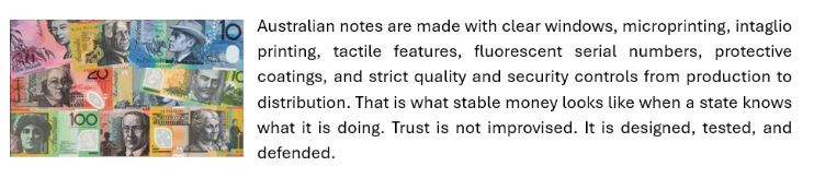 Australia waxay ku jirtaa nooc gebi ahaan ka duwan. Iyadu ma aha dal ku jahwareersan samaynta lacag cusub ama badbaadinta mid burbur ku jirta. Waxay maamulaysaa nidaam lacageed oo kalsooni sare leh, leh habab wax-soo-saar horumarsan, xakameyn adag oo wareegga lacagta ah, iyo tiknoolajiyad culus oo ka hortagta been-abuurka. Bangiga Dhexe ee Australia wuxuu sheegay in Australia ay ahayd dalkii ugu horreeyey ee soo saara dhammaan taxanaha lacagta warqadda ee polymer-ka ah, tiknoolajiyad ay si wadajir ah u sameeyeen RBA iyo CSIRO si ay uga hor maraan kuwa lacagta been-abuurta sameeya.