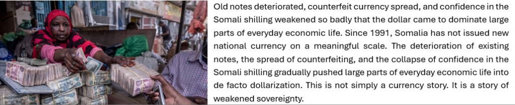 Lacagtu waa aalad siyaasadeed. Waa qaab kalsooni oo ay taagayaan sharci, hay’ado, iyo rumaysad bulsho. Waxay sii noolaataa oo keliya inta ay dad ku filan ku kalsoon yihiin. Marka kalsoonidu jabto, khiyaaliga oo dhan ayaa soo ifbaxa. Lacagta kaliya lama daabaco. Waa la maamulaa. Marka si wanaagsan loo maamuli waayo, dadku waxay helayaan hab kale oo ay noloshooda ugu wareejiyaan.
