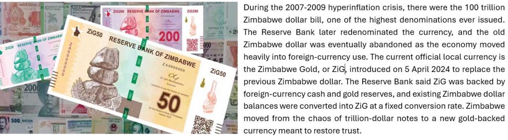 Bangiga Dhexe ee Zimbabwe wuxuu oggol yahay doolarka Maraykanka, lacagaha kale ee qalaad, iyo lacagta gudaha inay ahaadaan lacag sharci ah ilaa 31 Diseembar 2030. Bangiga dhexe ee Zimbabwe wuxuu sidoo kale isku dayay inuu lacagta gudaha ku ilaaliyo kayd taageero u ah. Qoraalkiisii Siyaasadda Lacageed ee 2026, RBZ wuxuu sheegay in kaydka lacagta qalaad ee la heli karo uu gaaray qiyaastii US$1.2 bilyan. Warbixinno dadweyne oo ku salaysan hadallo rasmi ah oo 2025 la bixiyey ayaa sidoo kale sheegay in kaydka dahabka dalka uu ahaa qiyaastii 3.4 tan metrik ah, kuwaas oo loo hayey in lagu taageero ZiG laguna xoojiyo kalsoonida lacageed.