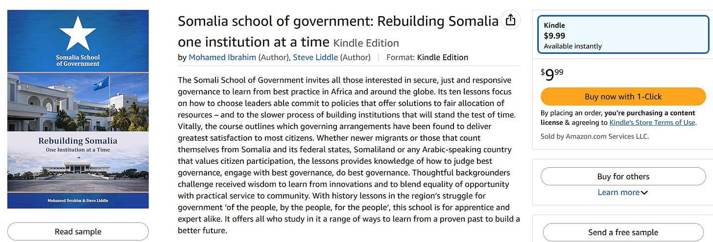 Sida lagu xusay qoraallo hore, waxaan sidoo kale ku talinayaa buugga hoos ku xusan, oo hadda ay heli karaan Soomaalida danaynaysa dimuqraadiyadda, sharciga, iyo dib-u-dhiska hay’adaha. Nooc warqad ah ayaa dhowaan iman doona. Waxaan ku farxi doonaa inaan si bilaash ah ugu diro nuqul dijitaal ah ardayda Soomaaliyeed, macallimiinta iyo shaqaalaha jaamacadaha ee leh emailo dugsi ama jaamacad. Fadlan ii soo dir email.