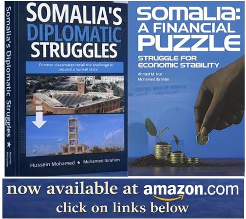 Qaybta buugga toddobaadkan waxay kasoo xiganaysaa buugaag aan dhowaan wada-qornay aniga, Hussein Mohamed, iyo Ahmed Nur, kuwaas oo kala ah Somalia’s Diplomatic Struggles iyo Somalia: A Financial Puzzle. Struggle for Economic Stability. Labaduba hadda waxay ku jiraan nooca paperback, halkan iyo halkan.