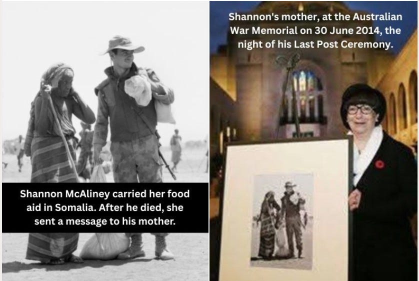 Taariikhdaasi sidoo kale waxay sidataa murugo shaqsiyeed oo qoto dheer. Lance Corporal Shannon McAliney, oo ka tirsanaa 1RAR, ayaa lagu dilay Baydhabo 2 Abriil 1993, dab saaxiibtinimo oo si kama’ ah u dhacay intii uu roondo ku jiray. Wuxuu ahaa askarigii keliya ee Australian ah ee ku dhintay howlgalka Soomaaliya. Dhowr sano ka hor, waxaan Ballina kula kulmay hooyadii, Liz Hanns. Kulankaasi wuu igu reebay raad, sababtoo ah wuxuu ka saaray sheekada ereyada qabow ee faragelinta, istaraatijiyadda, iyo xasillinta. Wuxuu dib ugu celiyay qisada runteedii ugu bini’aadannimada badnayd. Hooyo ayaa wiilkeedii ku weyday Baydhabo. Xanuunka Soomaaliya kuma ekayn xuduudaha Soomaaliya. Wuxuu gaaray qoys Australian ah, magaalo ku taalla New South Wales, iyo murugo sii nooleyd muddo dheer ka dib markii wararkii hore ay lumeen.