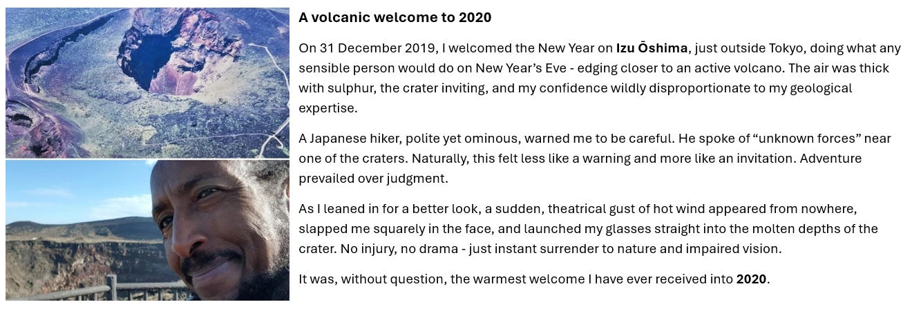 Ugu dambayn, dhowr qoraal ayaa ahaa kuwo milicsi ah. “Soomaaliya – Qaran u socda mustaqbal ifaya iyadoo taariikhdiisu la socoto” wuxuu falanqeeyay sida kala-qaybsigii gumeysiga iyo dagaalladii sokeeye ay weli u culays saaran yihiin sheekooyinka horumarka. “Fikrado socda si kulamada loogu beddelo ficil Soomaaliya” oo ka dhashay shir ganacsi iyo maalgashi 2025 ah, wuxuu weydiiyay sida kulamada qurba-joogta iyo indha-indheynta safarradu ugu beddeli karaan hindisayaal la taaban karo halkii ay ka ahaan lahaayeen sheekooyin luma. “Sanadkii tegay…” wuxuu isku xiray 2024 iyo 2025 milicsi shakhsiyeed, diin, iyo siyaasadeed, kuna soo ururay oraahda “Ha noqoto 2025 ka wanaagsan 2024”, rajo leh, balse miyir qaba oo ka warqaba baaxadda hawsha.